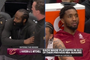 骑士VS独行侠,转播方晒出纪录:哈登和米切尔生涯每个赛季都打进了季后赛。
