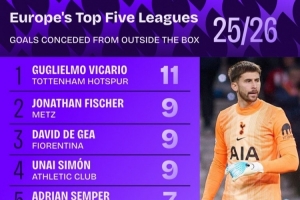 体育资讯3月17日讯 Squawka统计了本赛季门将在五大联赛禁区外失球的数量,并列出榜单,维卡里奥11球最多。