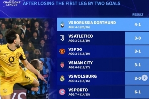 体育资讯2月26日讯 亚特兰大在本轮欧冠淘汰赛附加赛首回合0-2落后情况下,次回合4-1大胜多特蒙德,完成逆转晋级。《转会市场》也统计了近年欧冠淘汰赛首回合两球落败但最终晋级的对决: