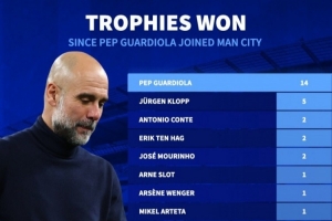自瓜帅入主曼城以来斩获14座奖杯,占英超俱乐部所获奖杯总数39%