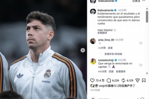 本场比赛巴尔韦德首发出战,赛后他也在个人社媒发文鼓励球队写道:“显然未能取得我们所期望的成绩与表现,但我们坚信定能扭转局面。Hala Madrid 🤍”
