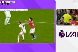 体育资讯04月14日讯 英超第32轮,曼联对阵利兹联。55分钟, VAR介入,主裁亲自观看回放,判罚利桑德罗拉拽勒温头发,将其红牌罚下。